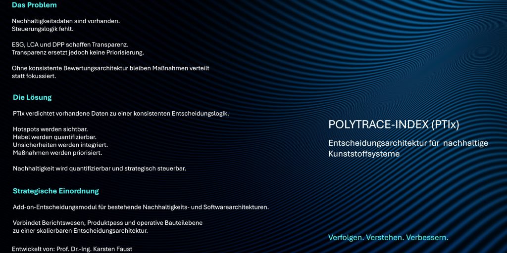 PolyTrace-IndEx™ (PTIx) ist ein wissenschaftlich fundiertes, Excel-basiertes 360°-Nachhaltigkeitsbewertungssystem für Kunststoffbauteile. Es integriert ökologische, ökonomische und materialtechnische Faktoren, macht diese vergleichbar und liefert eine klare, nachvollziehbare Grundlage für den Digital Product Passport (DPP).